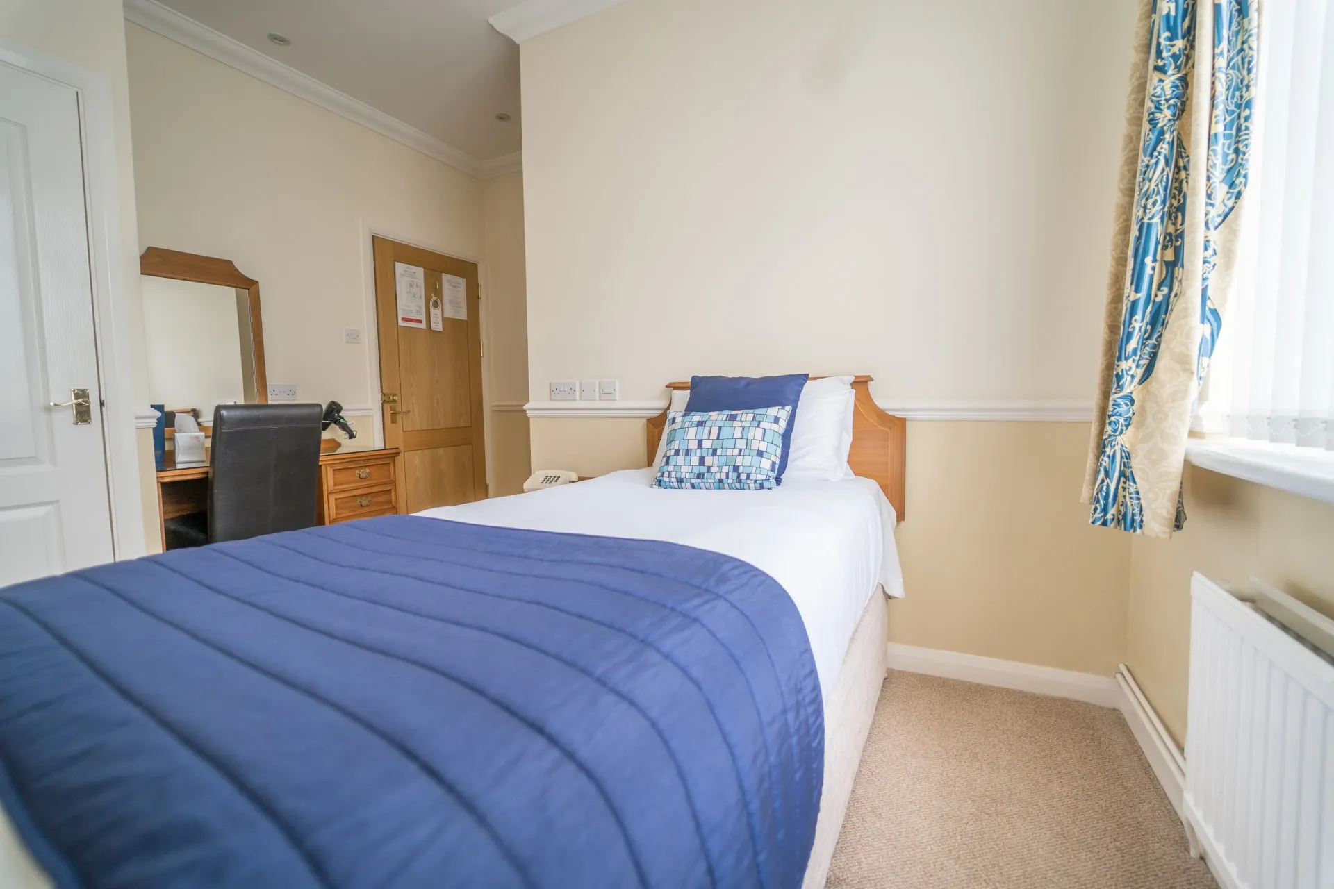 Our Single Rooms are thoughtfully designed to offer comfort, privacy, and everything you need for a restful stay. Each room features a cosy bed, ensuite bathroom with bath and overhead shower, and a complimentary hot beverage tray to help you relax from the moment you arrive. Modern touches such as a Freeview flat-screen TV, direct dial telephone, free Wi-Fi, and a personal safe ensure your convenience throughout your stay.